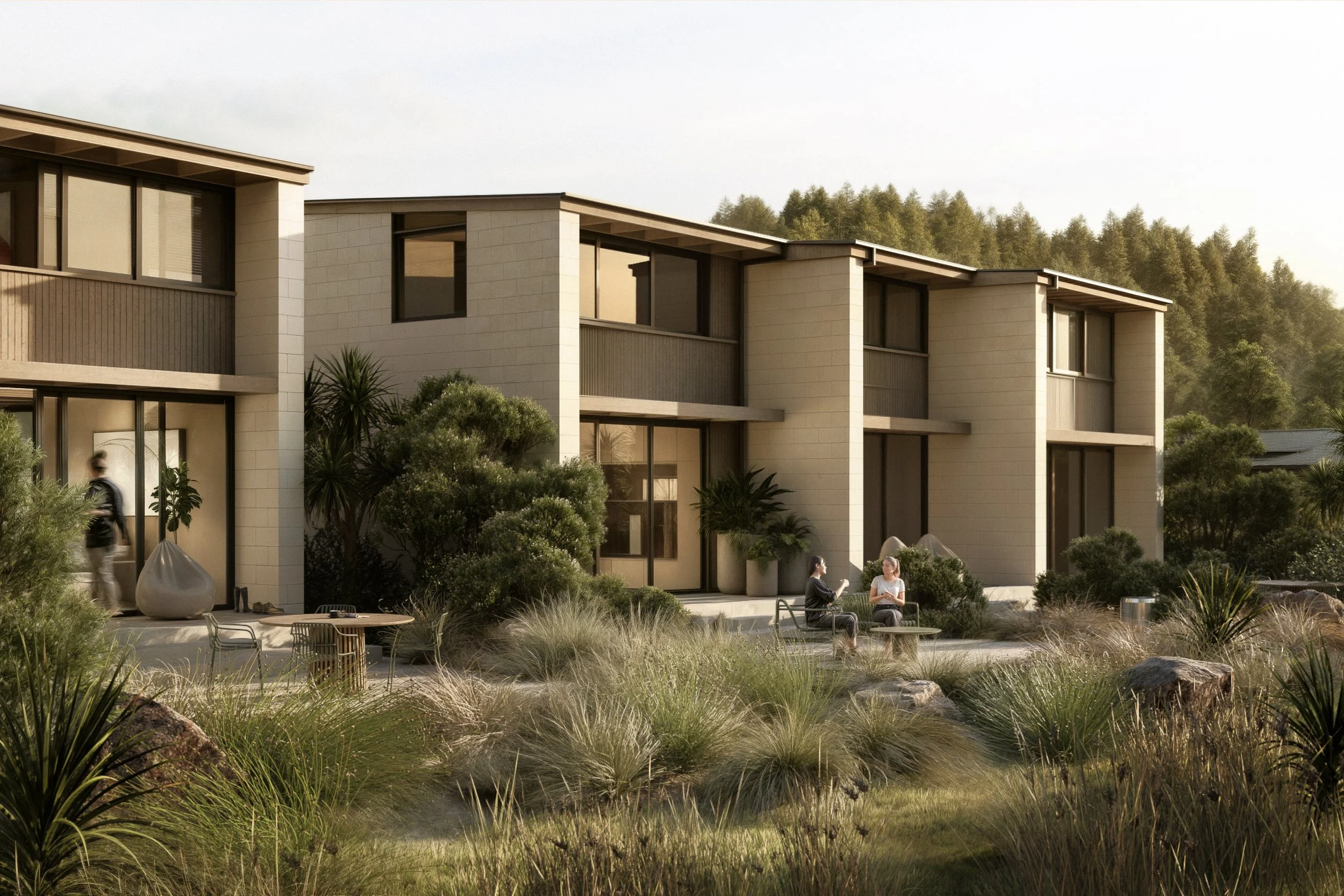 Cohousing is an intentional, self-governing, cooperative community where residents live in private homes and have access to shared spaces, landscapes and facilities. In this design the units comprise of a combination of two- and three-bedroom townhouses, formed into three clusters, each with outlook and a private garden to the north. Shared facilities include a common house, guest room, storage, bike store and workshop. The landscape is a key part of this project and aims to rehabilitate and regenerate the site and existing creek, improving the long-term ecological outcomes of the former farmland. Residents will have access to shared landscapes and productive gardens.